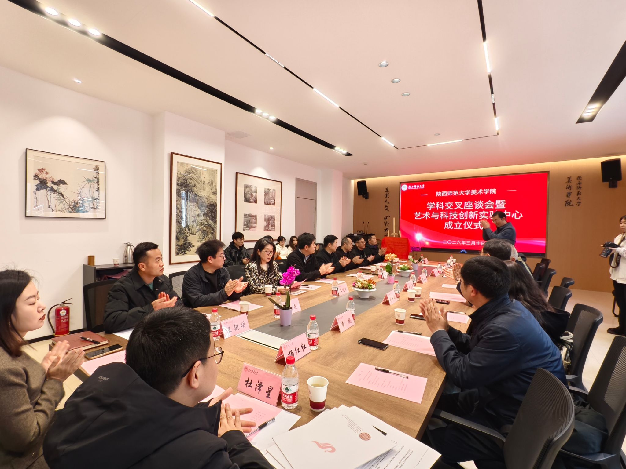 3月10日下午,陕西师范大学美术学院“学科交叉座谈会暨艺术与科技创新实验中心成立仪式”在六艺楼112会议室举行。会议由美术学院副院长王晓燕教授主持,学院领导班子、相关领域专家学者及教师代表齐聚一堂,共话发展。