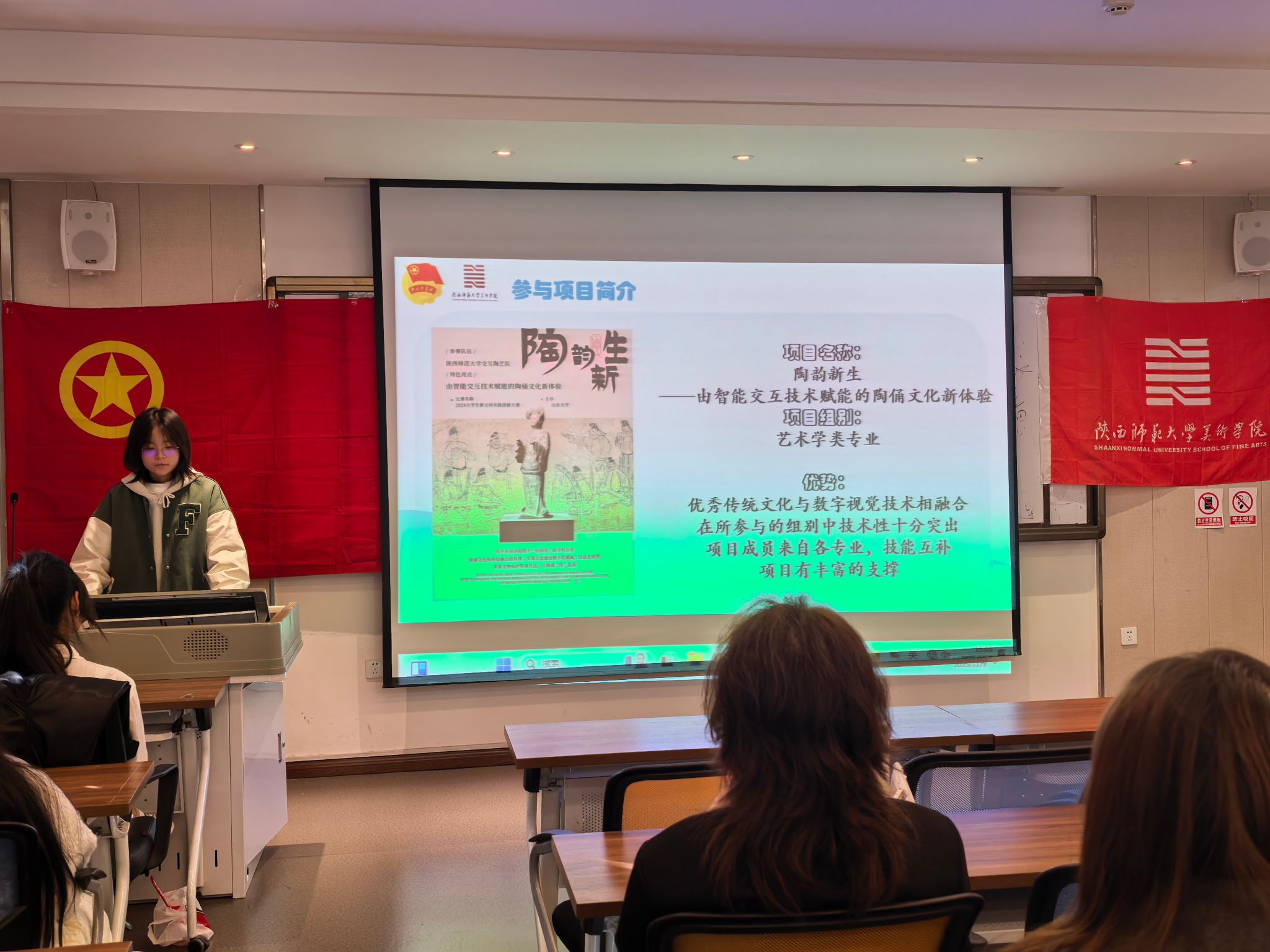在经验分享环节,两位同学结合参赛经历带来内容翔实的交流分享。2023级设计专业硕士研究生赵一遥以“黄河流域面花非遗玩具研发”项目为例,细致剖析了从选题调研、产品设计到推广落地的完整过程,生动展现了文化创意类项目的实践路径与创新思路。2023级书法(师范)专业本科生陈曦则结合新文科实践创新大赛的参赛体验,通过“陶韵新生”等优秀案例,阐释了如何将专业美学素养与设计思维转化为项目核心竞争力,并强调了视觉呈现与文字逻辑有机融合的重要性。
