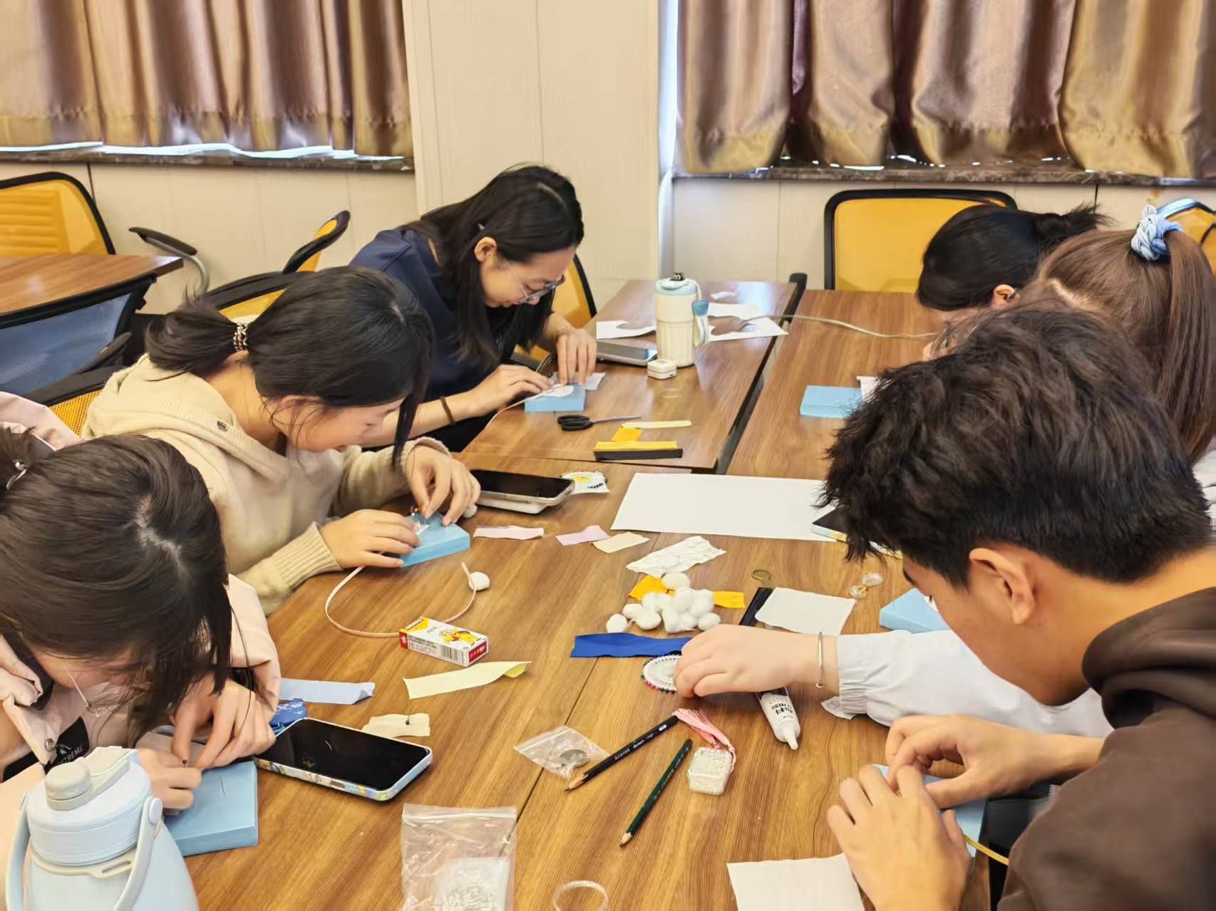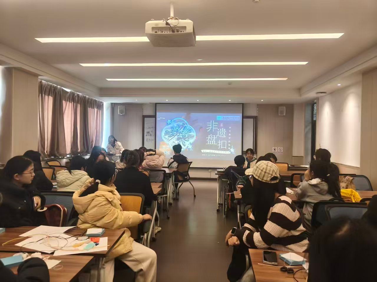 为普及非遗盘扣文化知识,让同学们近距离感受传统技艺魅力,推动非遗活态传承与创新,2025年12月20日下午,美术学院“启艺润心”美育小课堂第八期课程——非遗盘扣制作体验活动,在美术学院402教室顺利开展。本次课程由2024级美术学专业本科生谭舒予主讲。